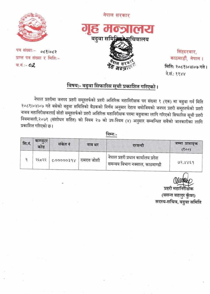 काठमाडौं । नेपाल प्रहरीका प्रहरी नायब महानिरीक्षक (डीआईजी) रामदत्त जोशी प्रहरी अतिरिक्त महानिरीक्षकमा सिफारिस भएका छन् ।