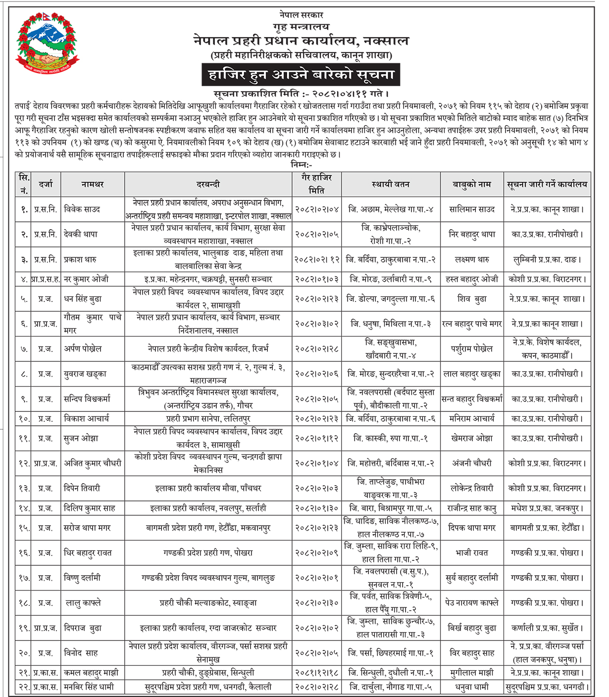 सूचनामा उल्लेख अनुसार, गैरहाजिर हुनेहरूमा १ जना प्रहरी सहायक निरीक्षक, १ जना प्राविधिक प्रहरी सहायक हबल्दार, १६ जना प्रहरी जवान तथा २ जना प्रहरी कार्यालय सहयोगी रहेका छन्।