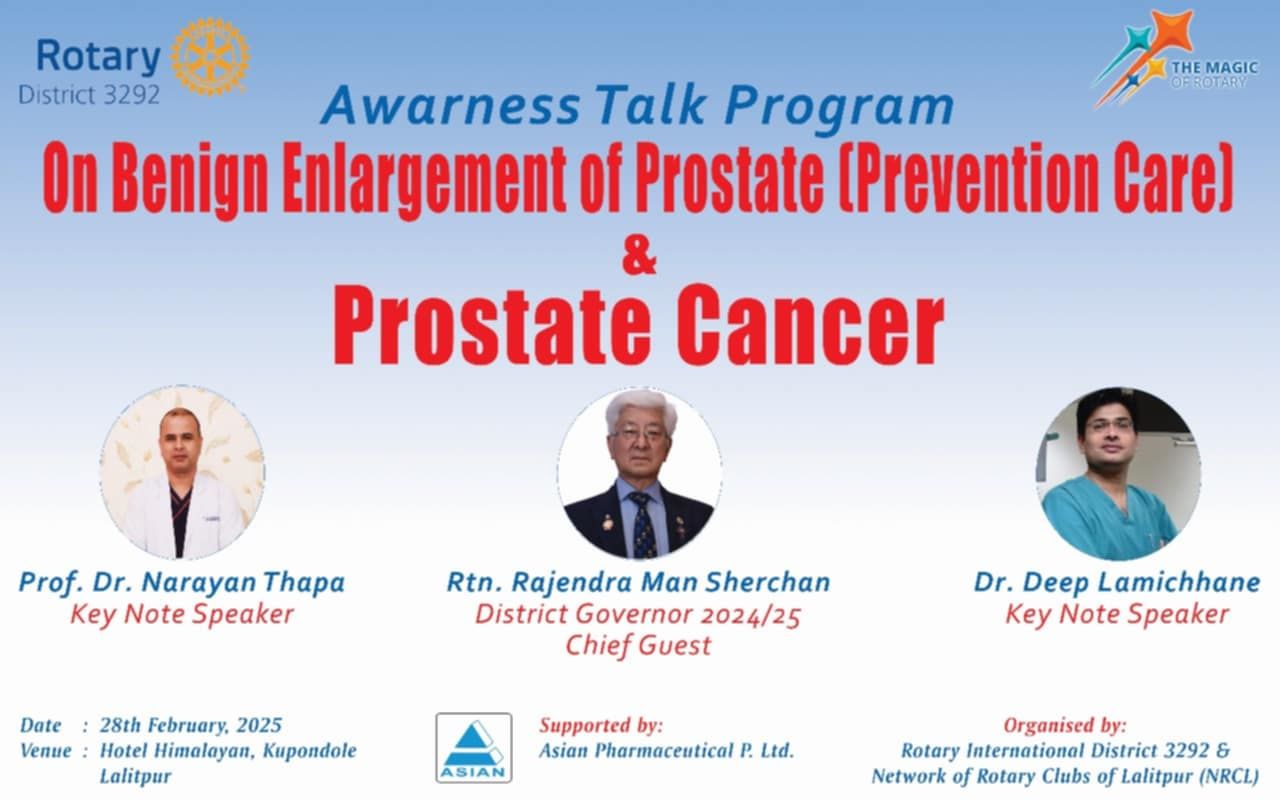 काठमाडौं । रोटरी इन्टरनेशनल डिस्ट्रिक्ट ३२९२ नेपाल भूटान र नेटवर्क अफ रोटरी क्लब अफ ललितपुर एनआरसीएलले पुरुषमा प्रोस्टेट ग्रन्थी बढेपछि उत्पन्न हुने समस्या र प्रोस्टट क्यान्सर सम्बन्धी बहस चलाएको छ ।