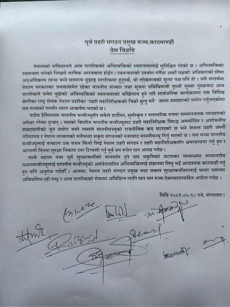 काठमाडौं । नेपाली कांग्रेसका नेता शंकर भण्डारी र पूर्वप्रहरी संगठन प्रमुख मञ्चका सदस्यहरुले सरकारका प्रवक्ता एवम् सञ्चार तथा सूचना प्रविधिमन्त्री पृथ्वीसुब्बा गुरुङलाई कारबाही गर्न प्रधानमन्त्रीसँग माग गरेका छन् । उनीहरुले छुट्टाछुट्टै विज्ञप्ति निकालेर मन्त्री गुरुङलाई कारबाहीको माग गरेका हुन् ।
