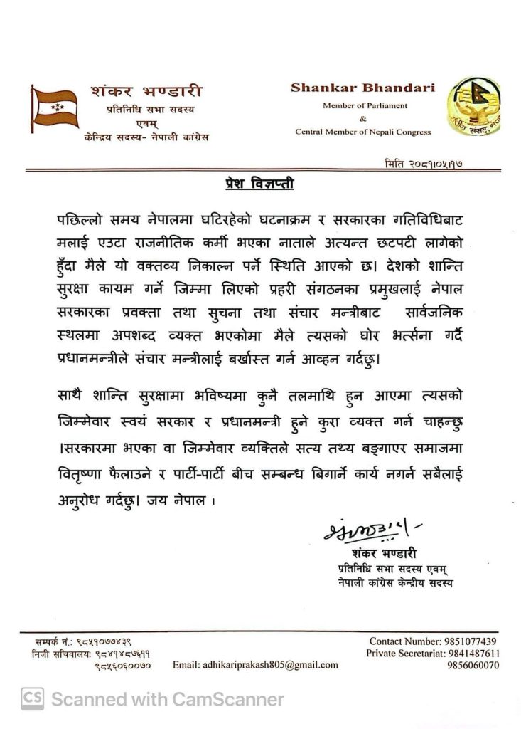 भण्डारीले जारी गरेको विज्ञप्तिमा लेखिएको छ, ‘देशको शान्ति सुरक्षा कायम गर्ने जिम्मा लिएको प्रहरी संगठनका प्रमुखलाई नेपाल सरकारका प्रवक्ता तथा सूचना तथा सञ्चार मन्त्रीबाट सार्वजनिक स्थलमा अपशब्द व्यक्त भएकोमा मैले त्यसको घोर भत्र्सना गर्दै प्रधानमन्त्रीले सञ्चार मन्त्रीलाई बर्खास्त गर्न आह्वान गर्दछु ।’