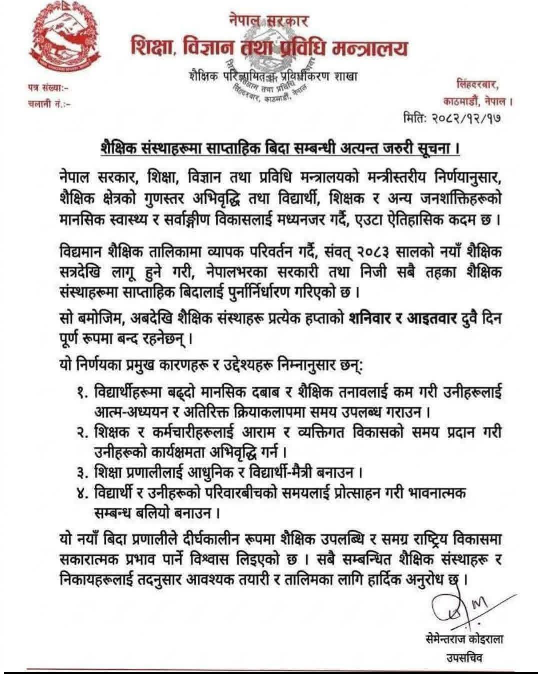 उक्त विज्ञप्तिमा ०८३ देखि देशभरका सरकारी तथा निजी सबै तहका शैक्षिक संस्थामा शनिबार र आइतबार पूर्ण रूपमा बिदा रहने उल्लेख गरिएको छ।