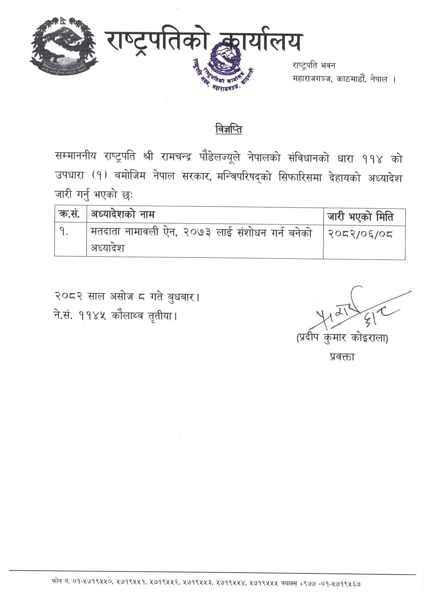राष्ट्रपति कार्यालयका प्रवक्ता प्रदीप कुमार कोइरालाले राष्ट्रपति रामचन्द्र पौडेलले नेपालको संविधानको धारा ११४ को उपधारा (१) बमोजिम नेपाल सरकार, मन्त्रिपरिषद्को सिफारिसमा मतदाता नामावली ऐन, २०७३ लाई संशोधन गर्न बनेको अध्यादेश जारी गरेको जानकारी दिए।