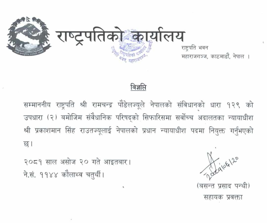 काठमाडौं । प्रकाशमानसिंह राउत प्रधानन्यायाधीश नियुक्ति भएका छन् । संवैधानिक परिषद्को सिफारिसमा राष्ट्रपति रामचन्द्र पौडेलले आज राउतलाई प्रधानन्यायाधीश नियुक्त गरेका हुन् ।