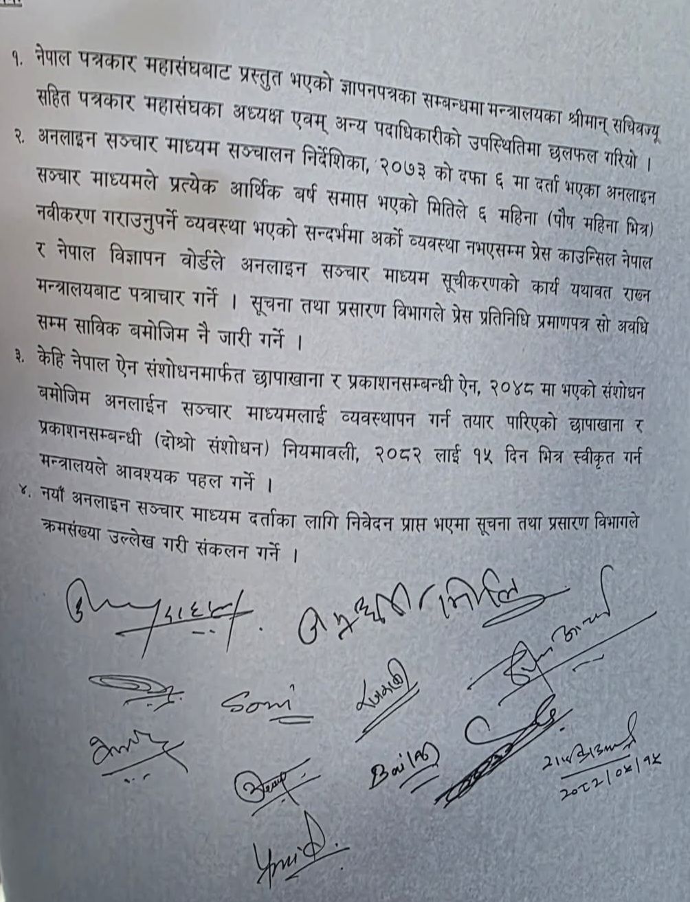 मन्त्रालयमा दुई पक्षबिचको छलफलपछि भएको सो सहमतिमा नयाँ अनलाइन सञ्चारमाध्यम दर्ताका लागि निवेदन प्राप्त भएमा सूचना तथा प्रसारण विभागले क्रमसङ्ख्या उल्लेख गरी सङ्कलन गर्ने,अनलाइन सञ्चारमाध्यम सञ्चालन निर्देशिका २०७३ को दफा ६ मा दर्ता भएका अनलाइन सञ्चार माध्यमले प्रत्येक आर्थिक वर्ष समाप्त भएको मितिले ६ महिना (पौष महिना भित्र) नवीकरण गराउनुपर्ने व्यवस्था भएको सन्दर्भमा अर्को व्यवस्था नभएसम्म प्रेस काउन्सिल नेपाल र नेपाल विज्ञापन बोर्डले अनलाइन सञ्चारमाध्यम सूचीकरणको कार्य यथावत् राख्न मन्त्रालयबाट पत्राचार गर्ने लगायत रहेका छन् ।
