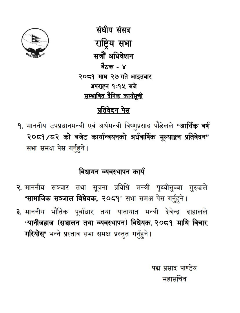 त्यस्तै राष्ट्रियसभामा उपप्रधानमन्त्री एवं अर्थमन्त्री विष्णुप्रसाद पौडेलले ’आर्थिक वर्ष २०८१–८२ को बजेट कार्यान्वयनको अर्धवार्षिक मूल्याङ्कन प्रतिवेदन’ सभा समक्ष पेस गर्नेछन् ।