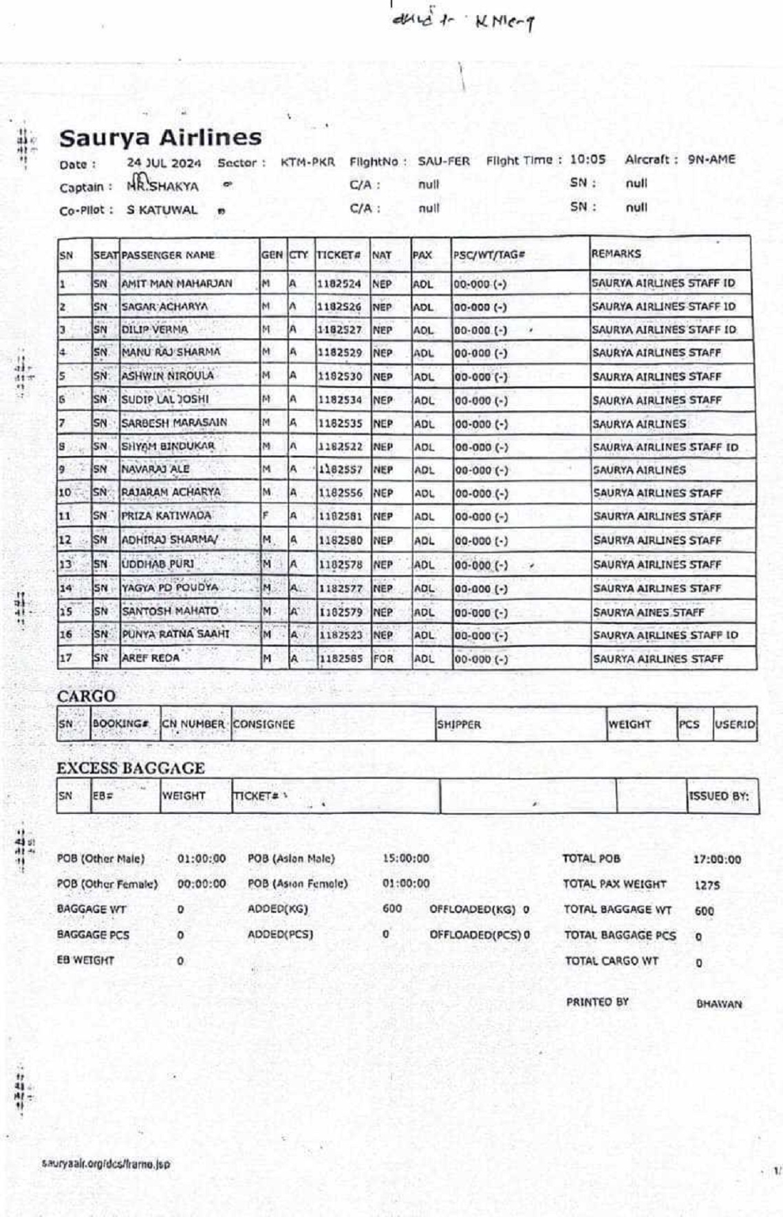 कम्पनीका अनुसार दुर्घटनाग्रस्त विमानमा चालकदलबाहेक अमितमान महर्जन, सागर आचार्य, दिलिप बर्मा, मञ्जुराज शर्मा, अश्विन निरौला, सुदीपलाल जोशी, सर्वेश मरासिनी, श्याम बिन्दुकार, नवराज आले, राजाराम आचार्य, प्रिजा खतिवडा, अधिराज शर्मा, उद्धव पुरी, यज्ञप्रसाद पौडेल, सन्तोष महतो, पुन्यरत्न शाही र आरिफ रेडा कर्मचारी रहेका थिए।