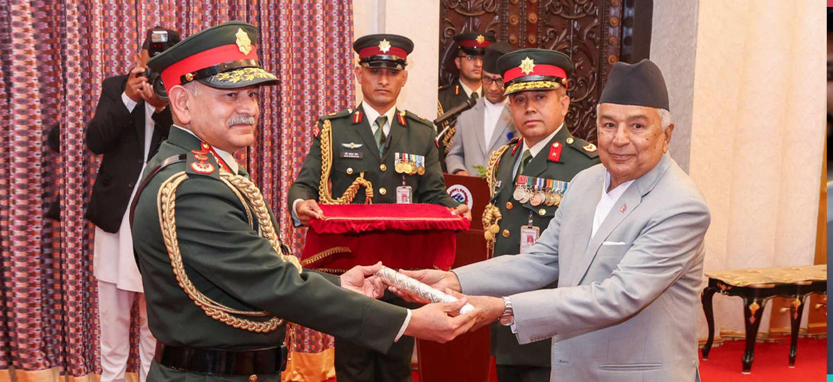 काठमाडौं । राष्ट्रपति रामचन्द्र पौडेलले भारतीय स्थल सेनाध्यक्ष उपेन्द्र द्विवेदीलाई नेपाली सेनाको मानार्थ महारथीको दर्जा प्रदान गरेका छन् ।