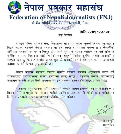 काठमाडौं । कुटपिटबाट मारिएका कैलालीको पत्रकार सुरेश भुलको घटनाको अनुसन्धानका लागि नेपाल पत्रकार महासंघले मिसन टोली खटाएको छ ।