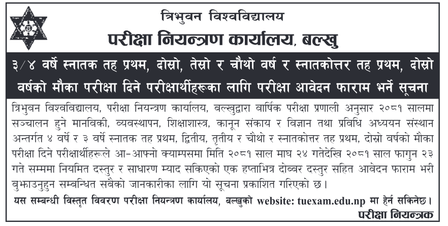 ‘वार्षिक परीक्षा प्रणाली अनुसार २०८१ सालमा सञ्चालन हुने मानविकी, व्यवस्थापन, शिक्षाशास्त्र, कानून संकाय र विज्ञान तथा प्रविधि अध्ययन संस्थान अन्तर्गत ४ वर्षे र ३ वर्षे स्नातक तह प्रथम, द्वितीय, तृतीय र चौथो र स्नातकोत्तर तह प्रथम, दोस्रो वर्षको मौका परीक्षा दिने परीक्षार्थीहरूले आ–आफ्नो क्याम्पसमा मिति २०८१ साल माघ २४ गतेदेखि २०८१ साल फागुन २३ गते सम्ममा नियमित दस्तुर र साधारण म्याद सकिएको एक हप्ताभित्र दोव्वर दस्तुर सहित आवेदन फाराम भरी बुझाउनुहुन अनुरोध छ,’ त्रिविले जारी गरेको सूचनामा भनिएको छ।