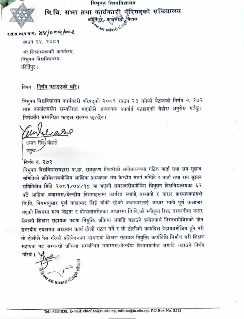 सोही कार्यदलको प्रतिवेदनका आधारमा शिक्षक सहायक नियुक्ति कार्यविधि निर्माण गरी शिक्षक सहायक पद सम्बन्धी प्रक्रिया सम्बन्धित क्याम्पस/केन्द्रीय विभागमार्फत अगाडि बढाउने निर्णय गरिएको थियो । तर, अहिलेसम्म प्रक्रिया अगाडि नबढाएको भन्दै संघर्ष समितिका अध्यक्ष लिम्बूले कात्तिक ३० गतेदेखि सञ्चालन हुने परीक्षा रोक्ने चेतावनी दिएका हुन् ।