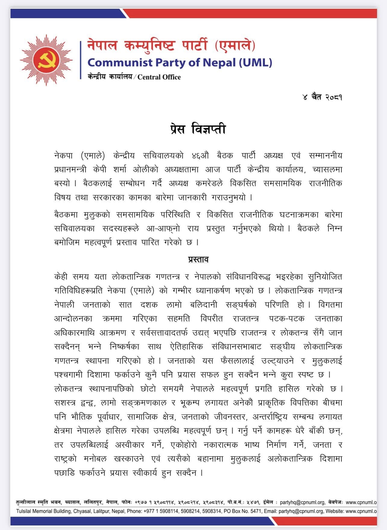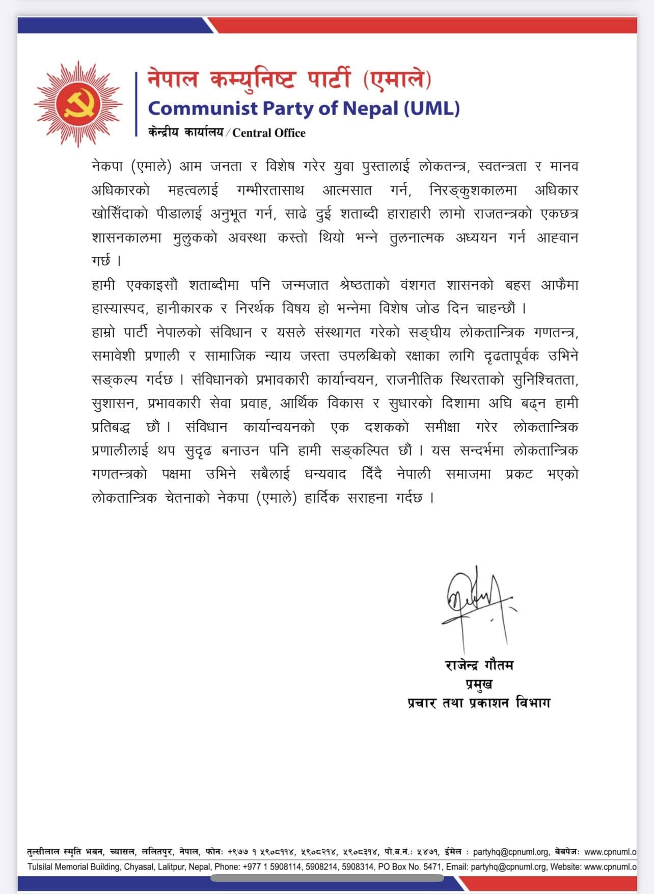विज्ञप्तिमा उल्लेख छ, ‘नेकपा एमाले आमजनता र विशेष गरेर युवा पुस्तालाई लोकतन्त्र, स्वतन्त्रता र मानव अधिकारको महत्त्वलाई गम्भीरता साथ आत्मसात गर्न, निरंकुशकालमा अधिकार खोसिँदाको पीडालाई अनुभूत गर्न, साढे २ शताब्दी हाराहारी लामो राजतन्त्रको एकछत्र शासनकालमा मुलुकको अवस्था कस्तो थियो भन्ने तुलनात्मक अध्ययन गर्न आह्वान गर्छ ।’