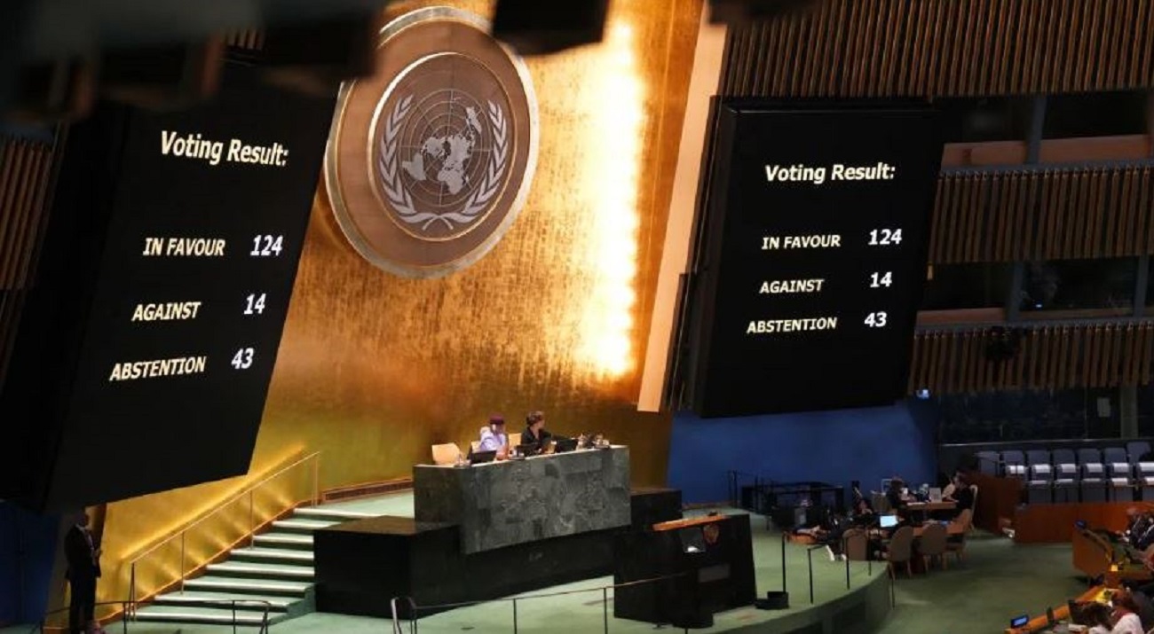 प्यालेस्टाइनले मस्यौदा गरेको उक्त प्रस्तावको पक्षमा १२४ राष्ट्र र विपक्षमा १४ राष्ट्र उभिएका छन् । नेपालसहित ४३ राष्ट्र तटस्थ बसे। गैरसदस्य पर्यवेक्षक राष्ट्र भएकाले प्यालेस्टिनी प्रतिनिधिले मतदान गर्ने पाएनन् । राष्ट्रसङ्घको महासभाबाट निर्णय गर्न भएको मतदानमा नेपाल सहभागी नभई तटस्थ बसेको हो ।