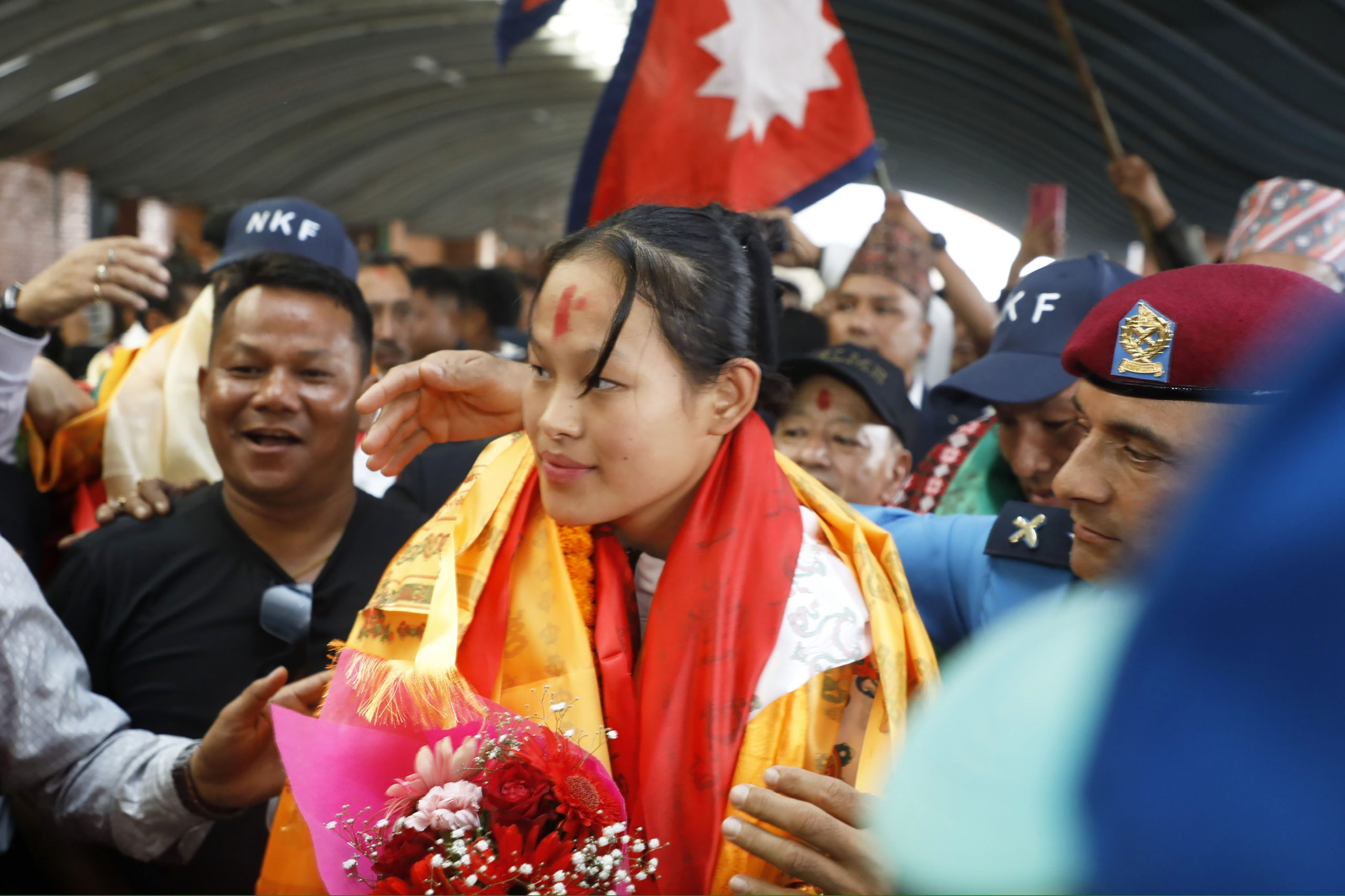 काठमाडौं । एसियन सिनियर कराते च्याम्पियनसिपमा रजत पदक जितेकी एरिका गुरुङलाई काठमाडौंमा स्वागत गरिएको छ। चीनको हाङझाओ शहरमा आयोजित प्रतियोगितामा रजत पदक जितेर स्वदेश फर्किएकी गुरुङलाई मंगलबार त्रिभुवन अन्तर्राष्ट्रिय विमानस्थलमा भव्य स्वागत गरिएको हो। त्यस्तै एसियन जुनियर कराते च्याम्पियनसिप र एसियन पारा कराते च्याम्पियनसिपमा सहभागी खेलाडीहरुलाई स्वागत गरिएको छ।